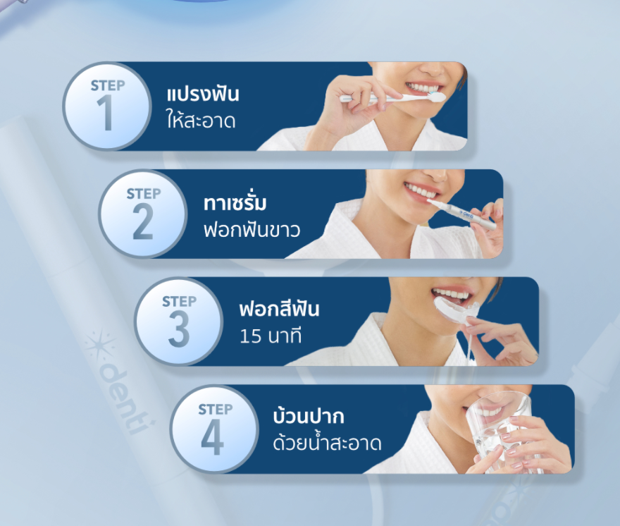 เพียงเตรียมฟันให้สะอาดและแห้ง จากนั้นทาเซรั่มลงไปบนเนื้อฟัน แล้วครอบเครื่องฟอกฟันไว้ 15 นาที เพียงแค่นี้ก็อวดรอยยิ้มฟันขาวได้แล้ว